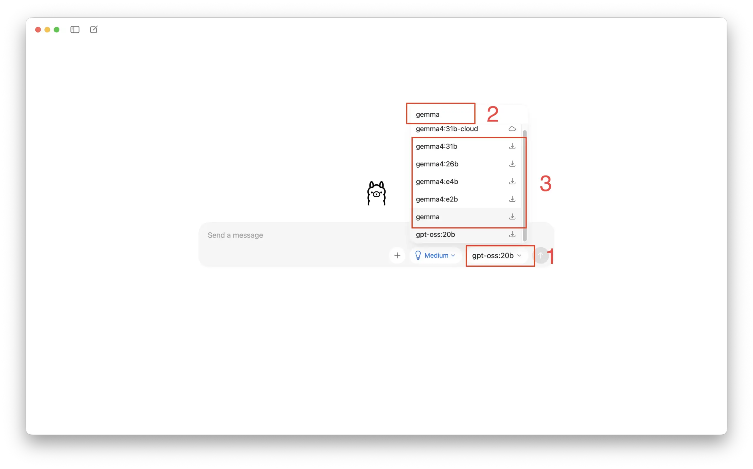 然後點擊下圖(1)的位置,在菜單欄的(2)輸入「Gemma」,在下方(3)的位置選擇你心儀的 Gemma 版本: